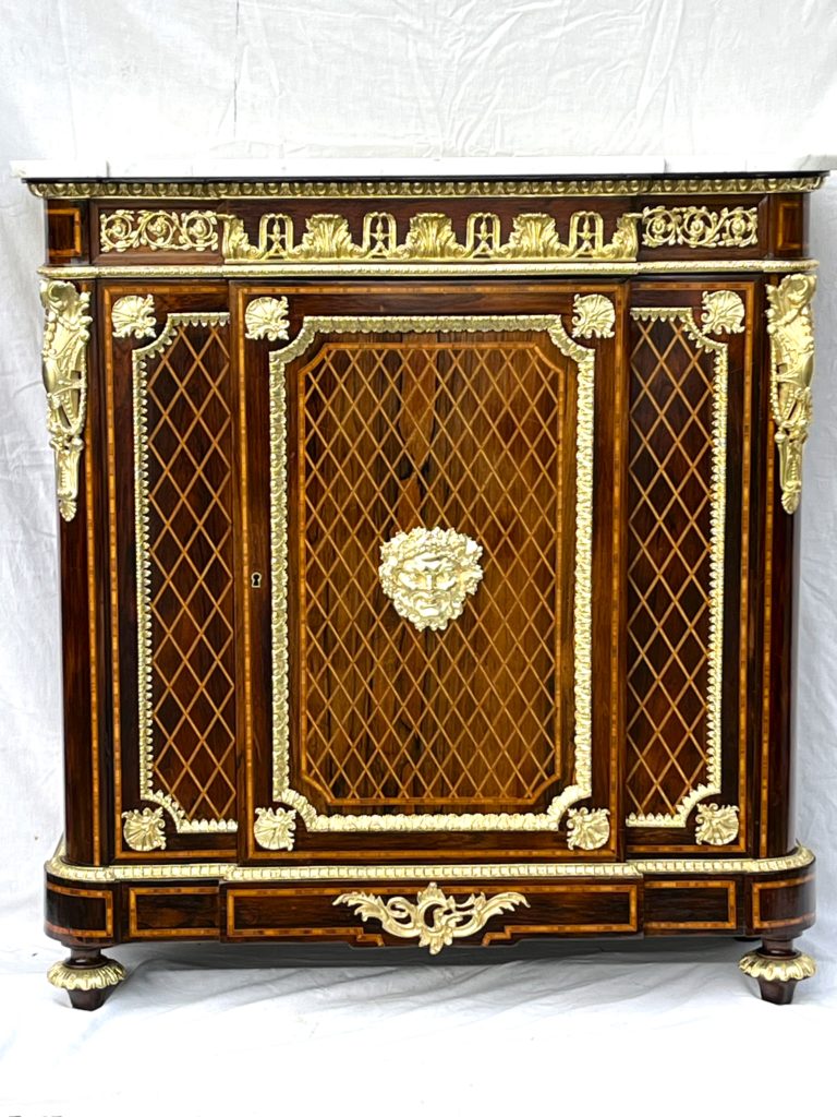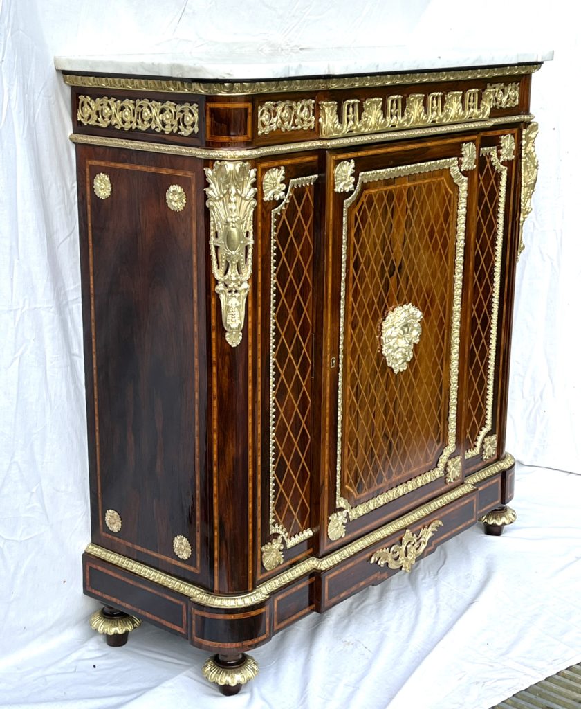 DESCRIPTIF / Meuble d’appui à dormants en placage de palissandre et marqueterie croisillon bois, marqueterie au bandeau sur le pourtour de toutes les pièces. Riches ornements de bronze, la plupart signés HPR pour Henri Picard et Raingo