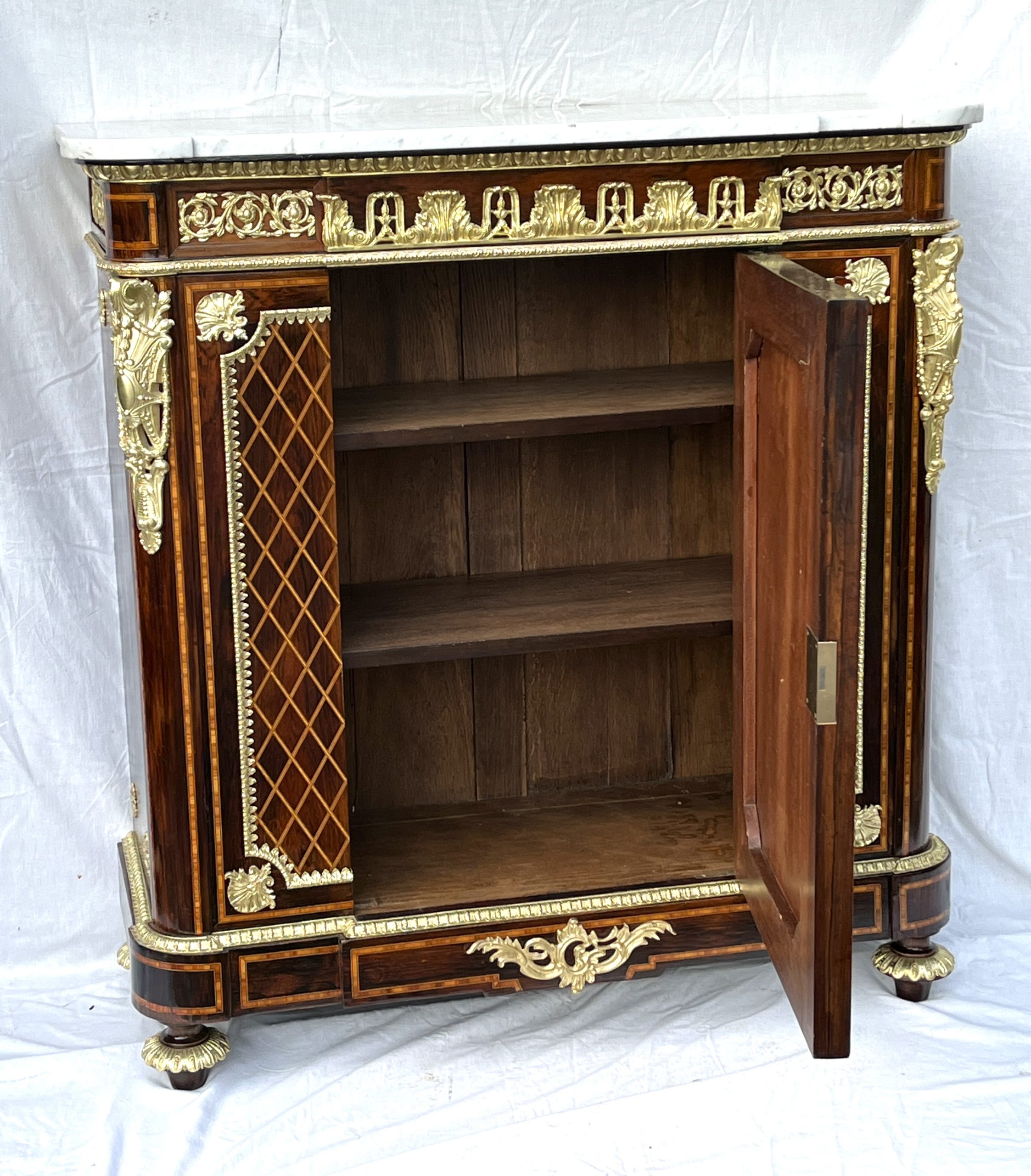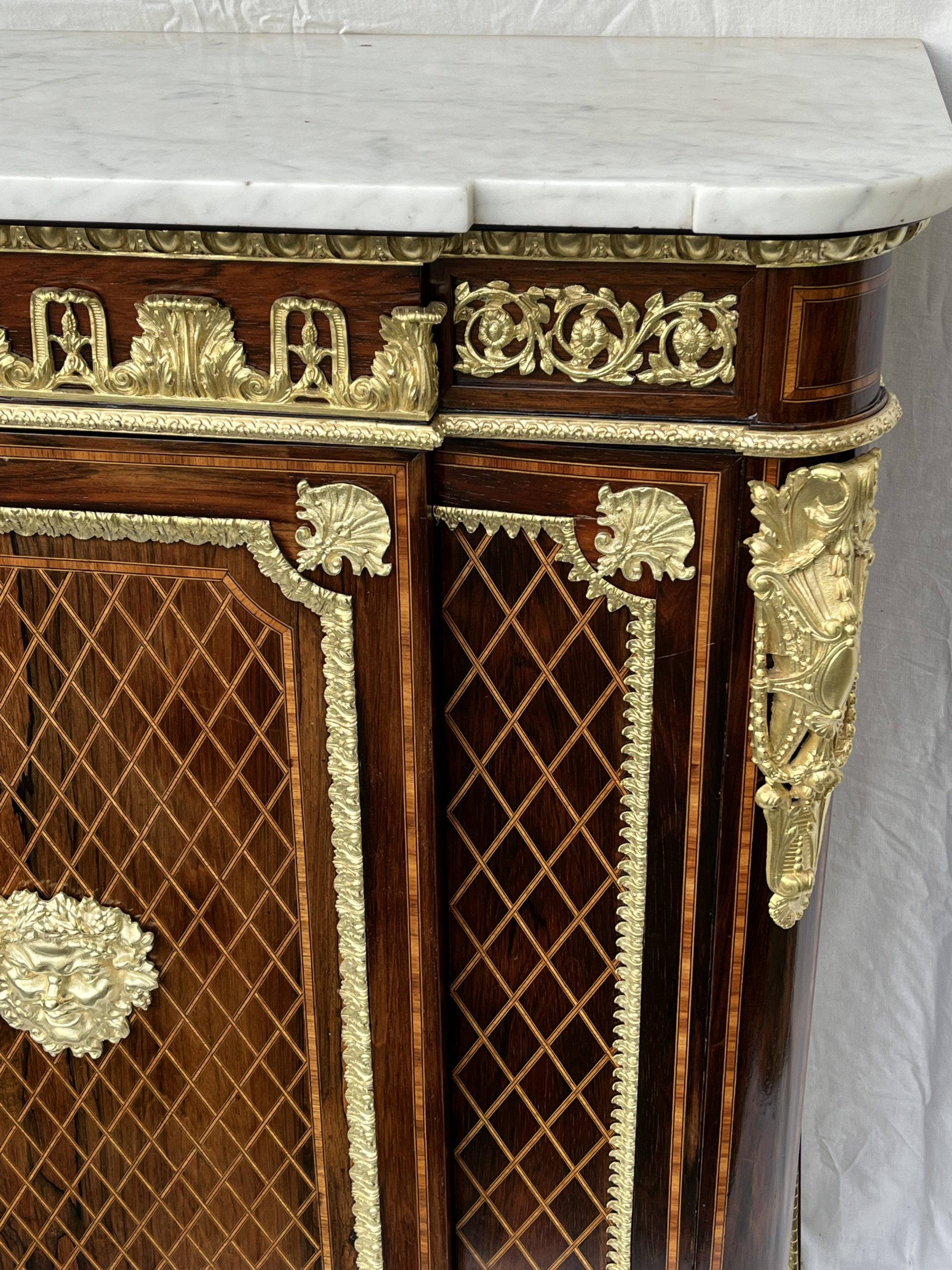 DESCRIPTIF / Meuble d’appui à dormants en placage de palissandre et marqueterie croisillon bois, marqueterie au bandeau sur le pourtour de toutes les pièces. Riches ornements de bronze, la plupart signés HPR pour Henri Picard et Raingo