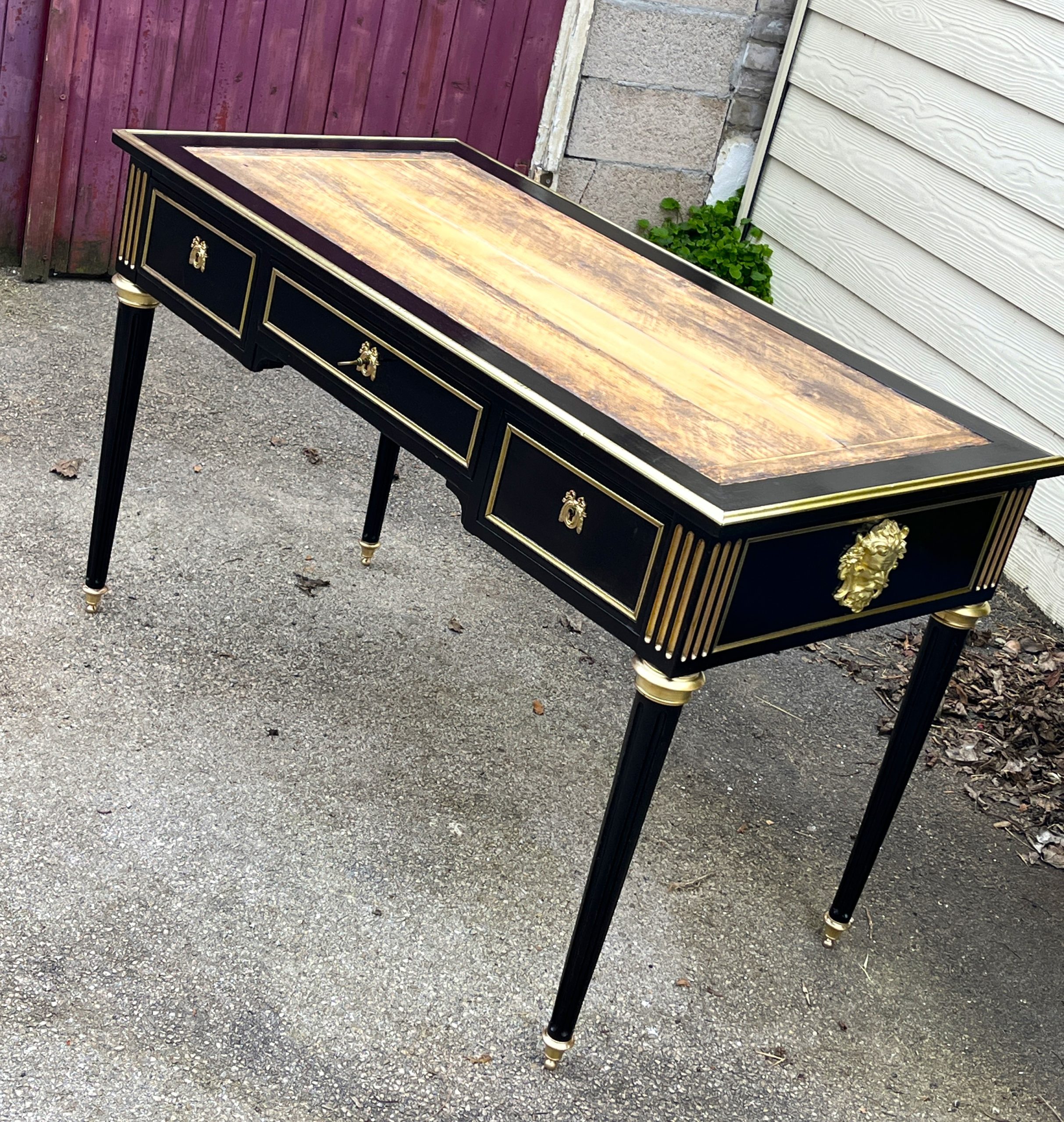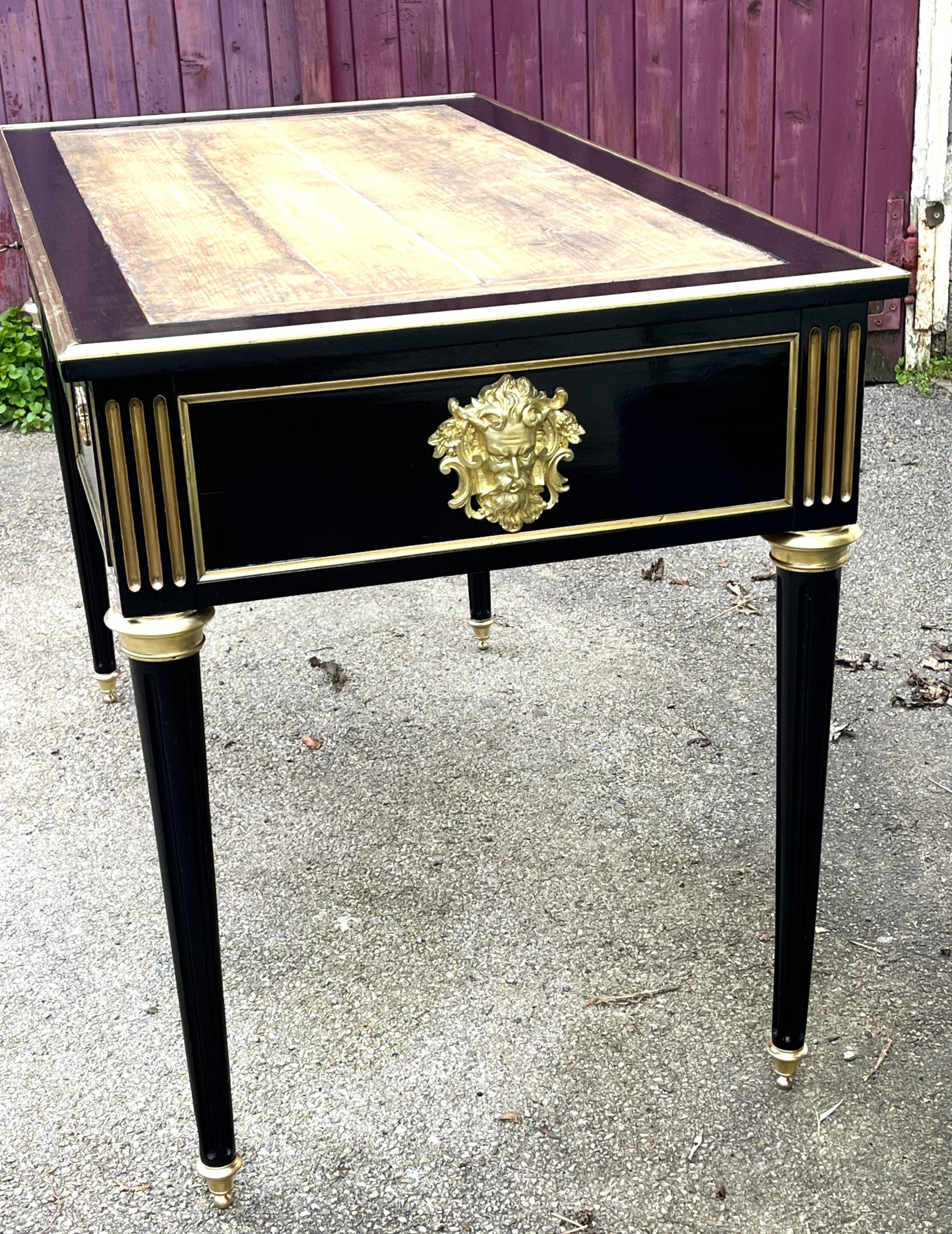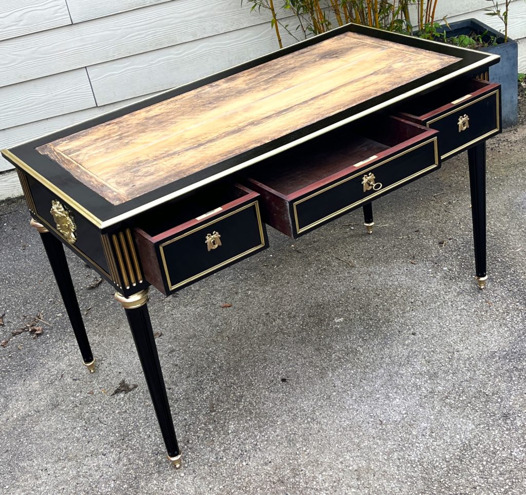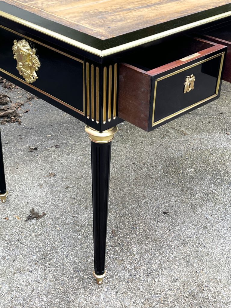 DESCRIPTIF /  Bureau de ministre en bois noirci avec décors de bois laiton, cannelures et ornements de bronze doré, ouvre en façade par 3 tiroirs avec serrures et clé fonctionnelles