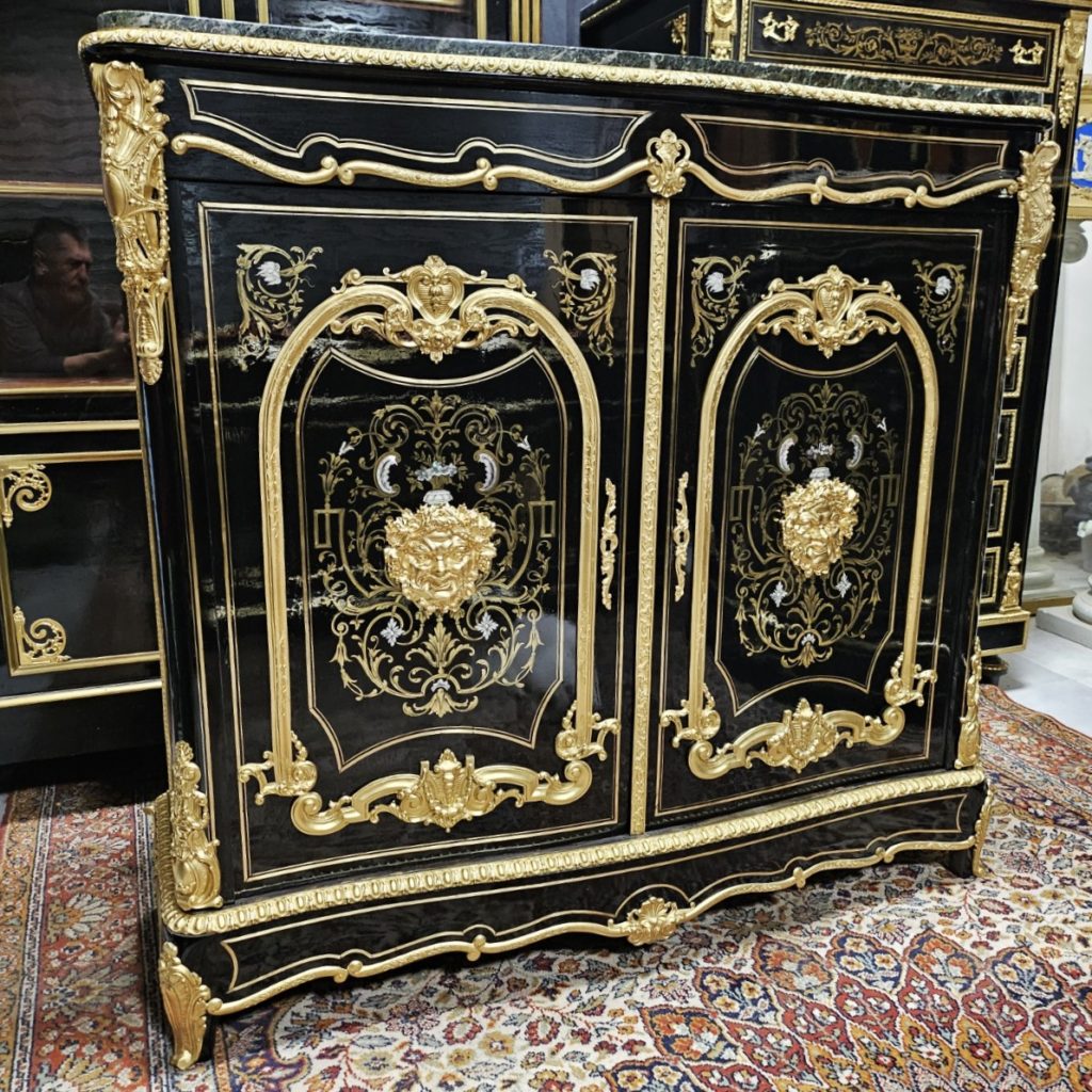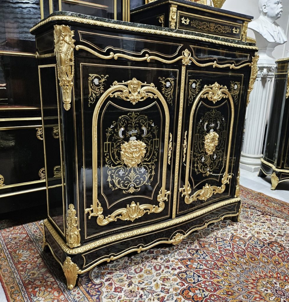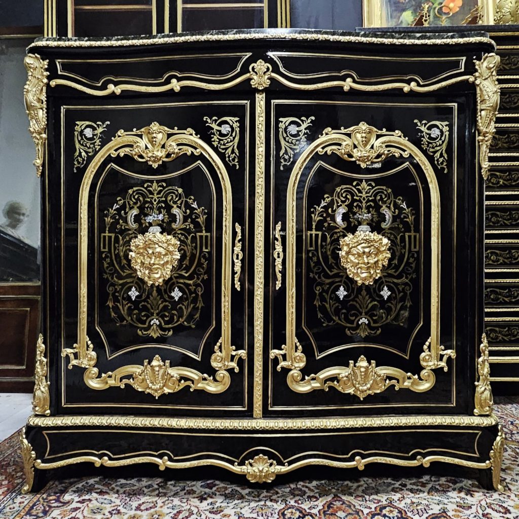 DESCRIPTIF : très beau meuble d’apparat deux portes en marqueterie boulle trois matières avec laiton, nacre et os, sur fond de placage ébène.