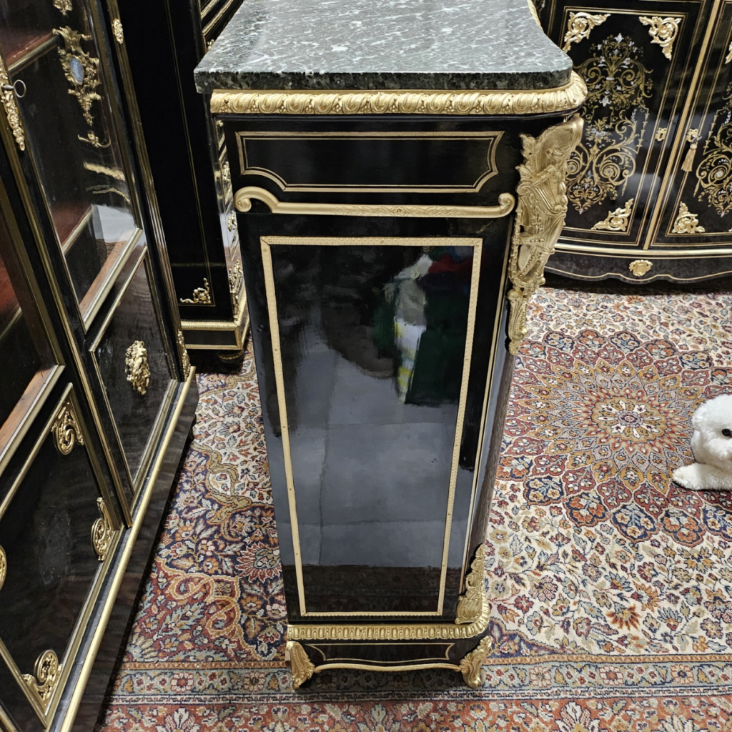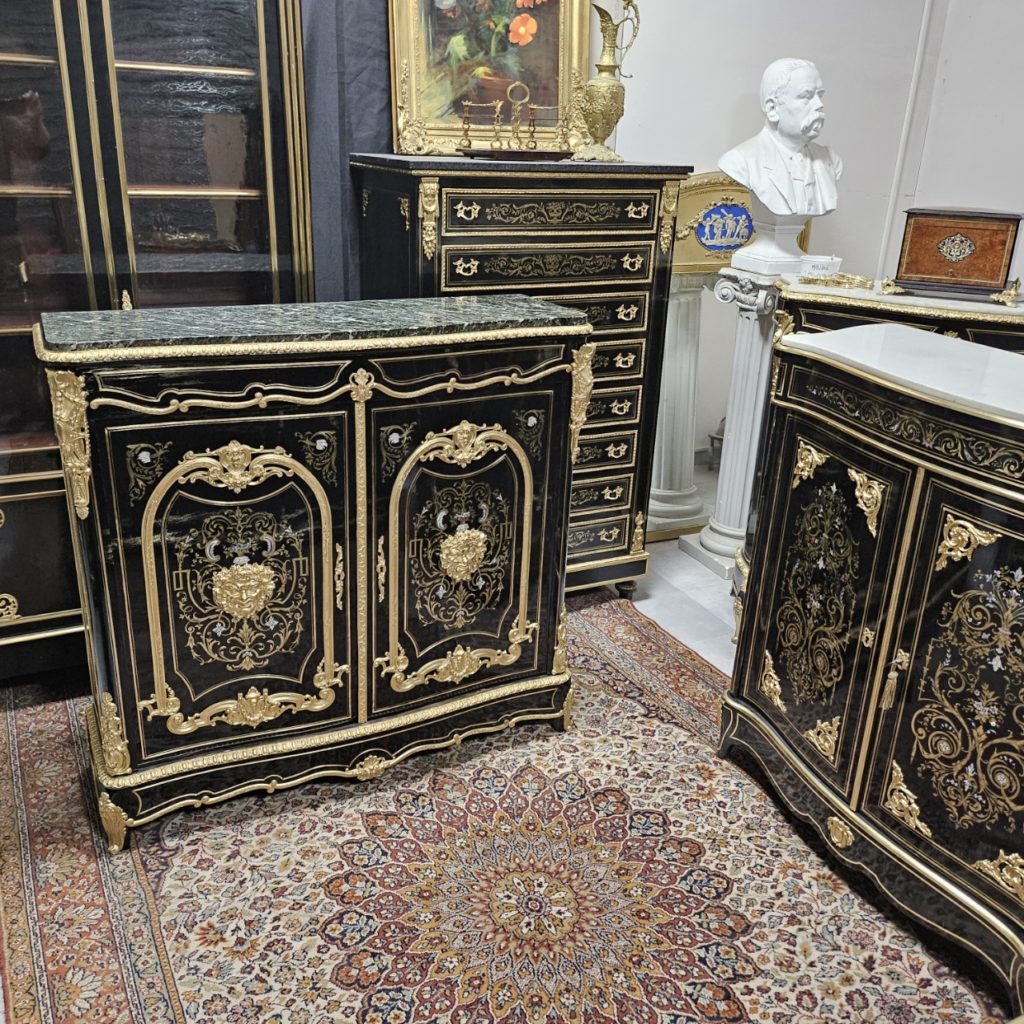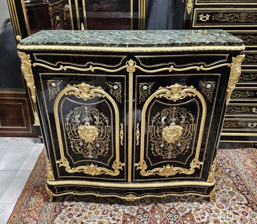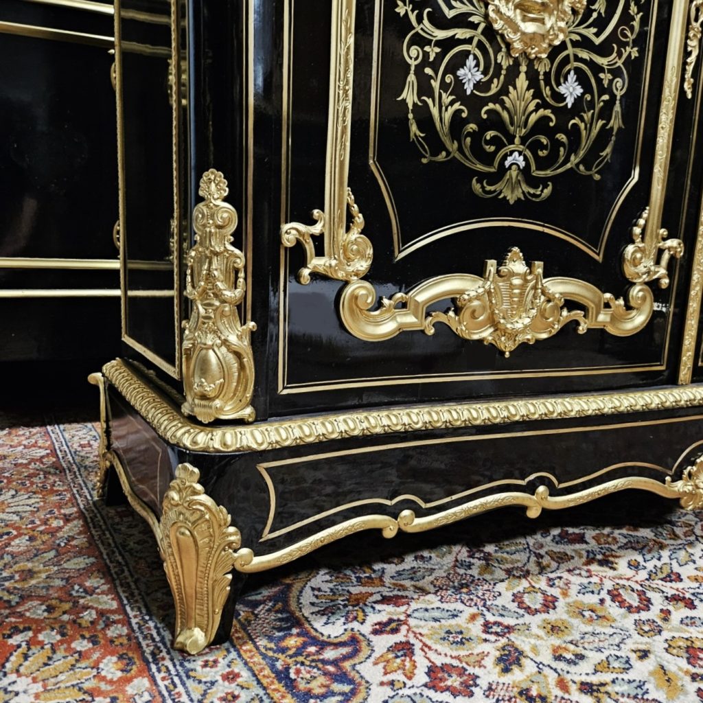 DESCRIPTIF : très beau meuble d’apparat deux portes en marqueterie boulle trois matières avec laiton, nacre et os, sur fond de placage ébène.