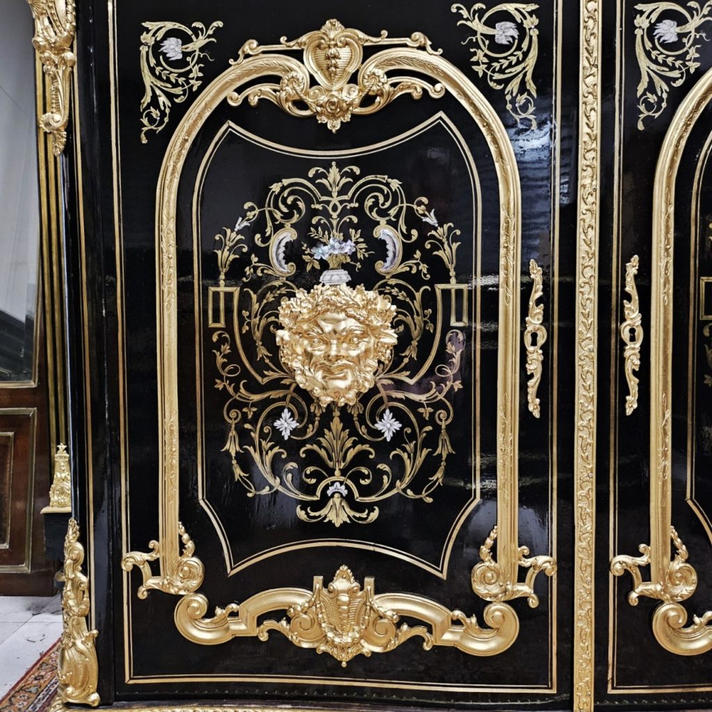 Au centre des portes, une importante marqueterie à motif de bouquets et urnes, encadrées de rinceaux, volutes et entrelacs de laiton, nacre et os, avec un rappel aux angles supérieurs, encadrant des masques de Bacchus.