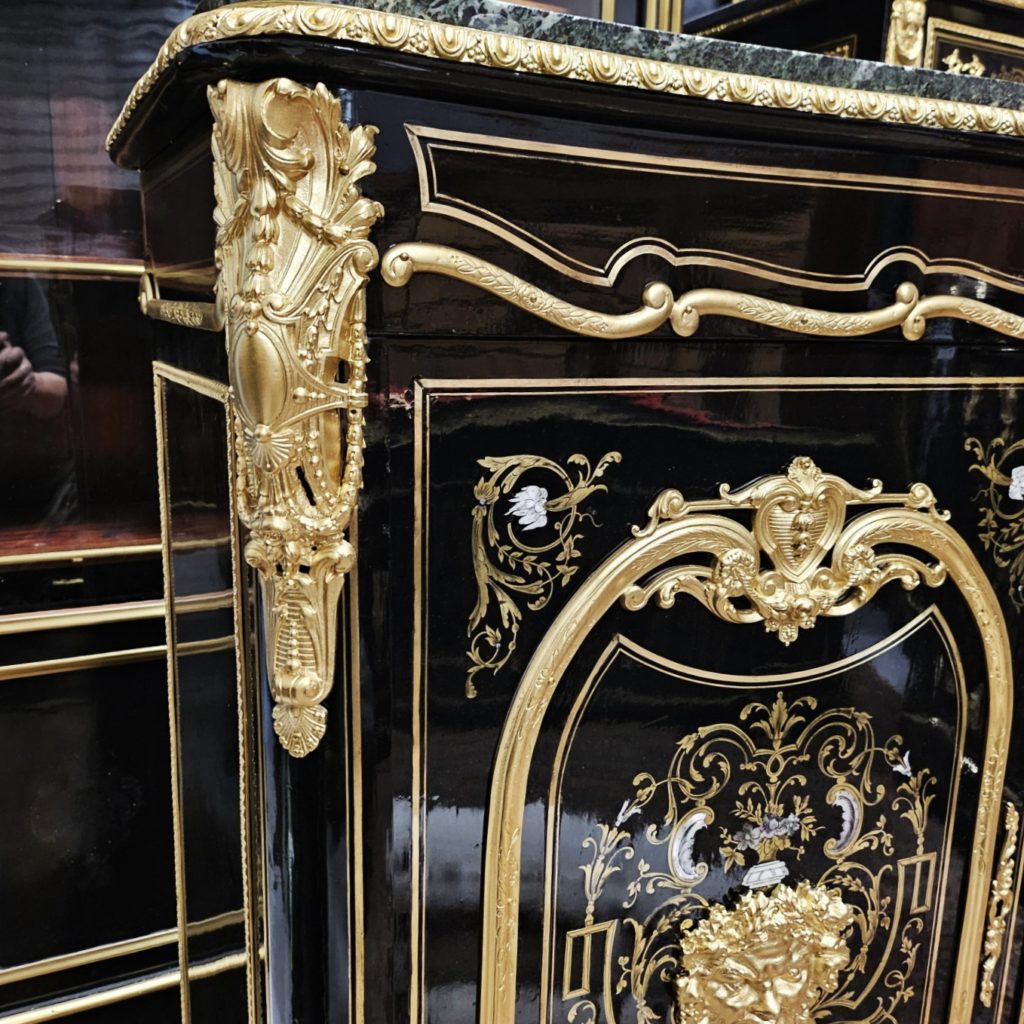 Très belle ornementation de bronzes dorés avec de grosses lingotières en encadrement des portes, lingotières mouvementées sur toutes les parties du meuble, ce qui lui confère un grand raffinement.
